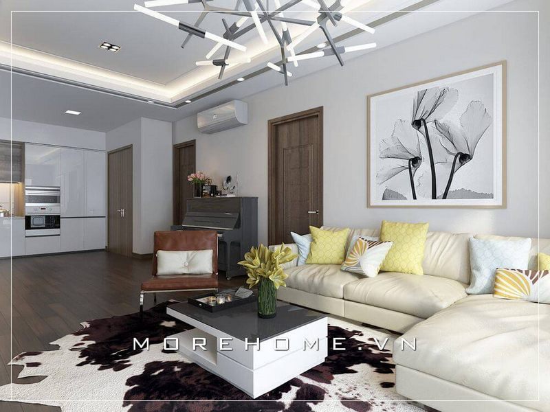 Sự kết hợp giữa sofa hiện đại kem sữa và tranh hoa đen trắng có thể tạo ra một không gian độc đáo cho phòng khách căn hộ chung cư khi bố trí lại.