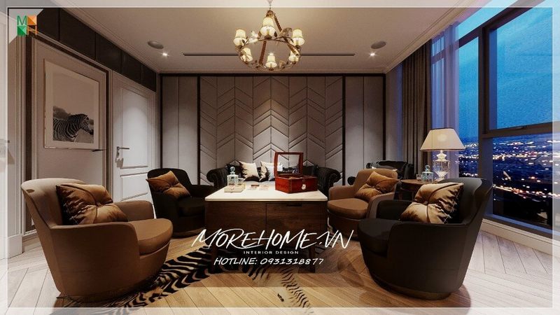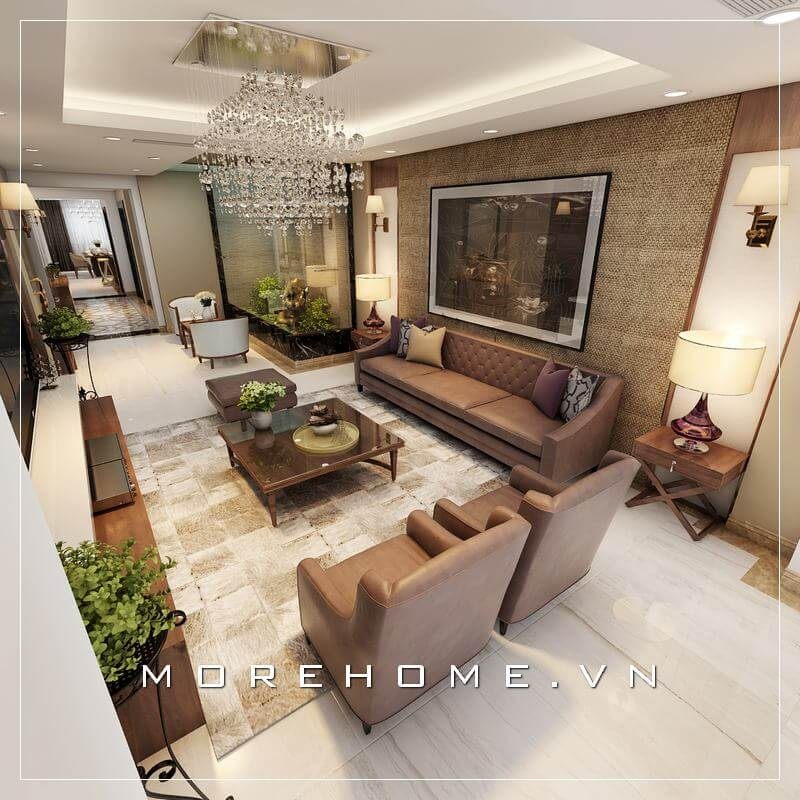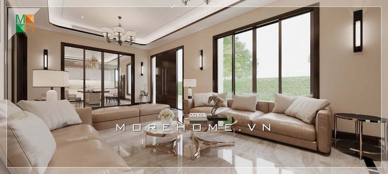 Bộ sofa phòng khách hiện đại có thiết kế bọc da màu nâu cao cấp, kết hợp với bàn trà vuông mặt kính đơn giản, mang lại ấn tượng tiện nghi cho không gian tiếp khách của gia chủ.